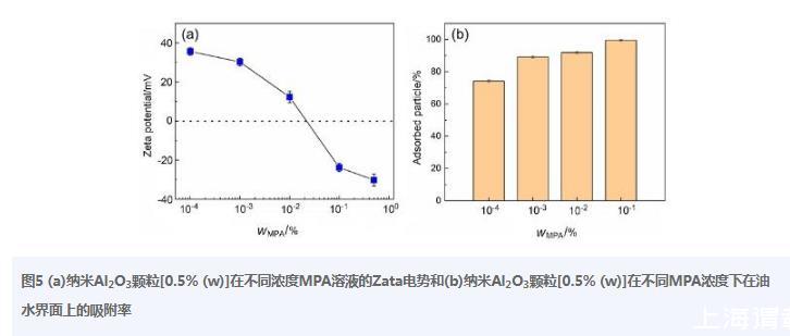 圖5(a)納米Al2O3顆?!?.5%(w)】在不同濃度MPA溶液的Zata電勢和(b)納米Al2O3顆?!?.5%(w)】在不同MPA濃度下在油水界面上的吸附率
