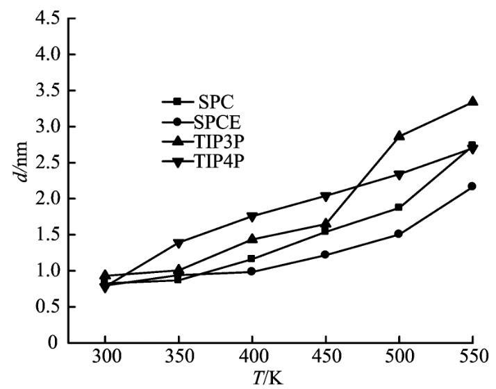 從圖6中可以看出,隨著溫度的增加,界面厚度在不斷增加,而且溫度越高增加幅度越大,其中TIP3P模型的界面厚度增長(zhǎng)幅度最大。