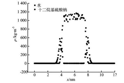 向純水中加入十二烷基硫酸鈉表面活性劑,水分子3 000個(gè),十二烷基硫酸鈉20個(gè),模擬得到300 K下水—表面活性劑體系的密度分布,如圖8所示。由圖8可見,對(duì)于只有水的體系來說,其密度變化基本是符合由汽相到液相逐漸增加的趨勢(shì),而對(duì)于加入的表面活性劑十二烷基硫酸鈉的體系來說,其密度的變化情況與只有水的體系有明顯的不同。從圖8可以看出,在氣—液兩相的過渡區(qū)域,加表面活性劑的體系密度出現(xiàn)明顯的增長(zhǎng)。