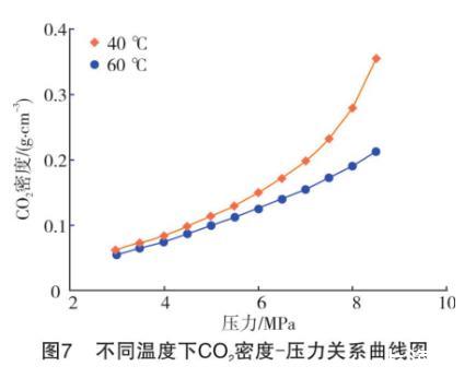 (3)溫度對(duì)界面張力隨壓力的影響存在一個(gè)關(guān)鍵壓力點(diǎn)。在實(shí)驗(yàn)壓力為3.5 MPa之前,40℃的界面張力值要高一些;在3.5 MPa之后,60℃的界面張力值更高。通過(guò)分析得出,在關(guān)鍵壓力點(diǎn)之前,溫度的熱效應(yīng)占主導(dǎo)作用;關(guān)鍵壓力點(diǎn)之后,溫度通過(guò)影響氣體密度和氣液密度差間接地影響界面張力值,取代溫度的熱效應(yīng)而成為主導(dǎo)因素。
