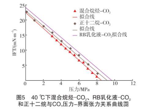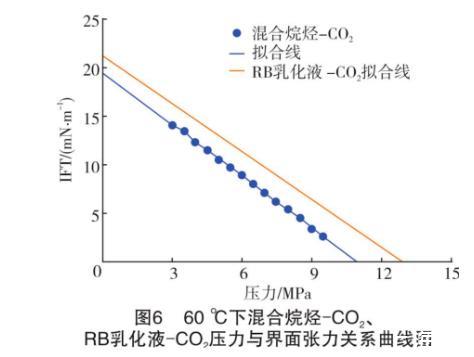 假設(shè)RB乳化液-原油不考慮斜率變化部分,始終以低壓階段(小于6 MPa)的斜率表示界面張力的變化。將表中同一溫度下不同系統(tǒng)的關(guān)系式展現(xiàn)在曲線圖上(見(jiàn)圖5和圖6)。從圖5和圖6可知,不論在哪個(gè)溫度下,混合烷烴和RB乳化液的壓力-界面張力曲線都接近平行,即兩種油的界面張力隨著壓力的升高幾乎以同樣的速度降低。計(jì)算得知,40℃和60℃下實(shí)驗(yàn)混合烷烴和RB原油的壓力-界面張力關(guān)系式中的斜率誤差為6.0%和8.6%??v觀兩種油的組成發(fā)現(xiàn),本實(shí)驗(yàn)所使用的混合烷烴中正十二烷的摩爾分?jǐn)?shù)達(dá)71.07%,而RB原油中的C12+的摩爾分?jǐn)?shù)達(dá)到57.66%。也就是說(shuō),混合烷烴和原油的組分中占主導(dǎo)作用的是高碳數(shù)的正構(gòu)烷烴。據(jù)姬澤敏等的大量實(shí)驗(yàn)研究,界面張力在不同的正構(gòu)烷烴-CO2體系中具有極好的規(guī)律性,在相同的溫度壓力條件下,正構(gòu)烷烴的碳數(shù)和界面張力成正比關(guān)系。從文獻(xiàn)中RB原油組成分析得知,C12+的分子量高達(dá)366 g/mol,而本實(shí)驗(yàn)中的混合烷烴的分子量?jī)H為156.74 g/mol。由此得知,實(shí)驗(yàn)誤差的主要來(lái)源是高碳正構(gòu)烷烴的組成不同。