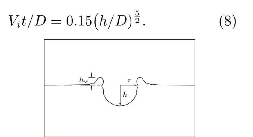 3)液滴撞擊深水液池后,空腔深度先以較快速度增長(zhǎng),在到達(dá)最大空腔深度后快速回彈,至接近原自由液面后速度逐漸放緩。在忽略毛細(xì)波作用、空腔深度為h=D至h=hmax范圍內(nèi)的前提下,空腔深度隨時(shí)間的成長(zhǎng)關(guān)系可由(Vit)/D=0.15(h/D)5/2來描述,但最終空腔底部的形成是由毛細(xì)波運(yùn)動(dòng)決定的;空腔寬度的增長(zhǎng)主要由毛細(xì)波運(yùn)動(dòng)及其干擾驅(qū)動(dòng),最后在慣性力作用下線性增長(zhǎng)。