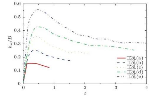 圖7及圖8分別為不同工況下波浪隆起高度hw和空腔寬度r隨時(shí)間的變化過程。由圖7易得,水滴撞擊水池后波浪高度的變化過程也經(jīng)歷了從快速增長(zhǎng)到逐漸回落,最終在慣性力的作用下自主運(yùn)動(dòng),趨于穩(wěn)定的過程。隨著弗勞德數(shù)的增大,更大的垂向速度在創(chuàng)造更深空腔的同時(shí)激發(fā)了更高的最大波浪隆起高度。從圖8可以看出,空腔寬度的增長(zhǎng)與波浪的運(yùn)動(dòng)息息相關(guān),在撞擊產(chǎn)生的動(dòng)能與波浪自身重力勢(shì)能基本耗散后,空腔運(yùn)動(dòng)主要由毛細(xì)波及其干擾驅(qū)動(dòng),最后在慣性下線性增長(zhǎng)。毛細(xì)波現(xiàn)象在圖8工況(e)的t=0.8時(shí)非常顯著,其周期在圖6的t=1.5—2.5中也有體現(xiàn)。