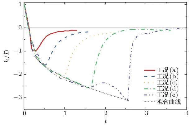 圖6為不同工況下空腔深度h隨時(shí)間的變化過程。由圖6可以看出,液滴撞擊深水液池后,由于動(dòng)能、空腔側(cè)壁隆起部分重力勢(shì)能以及表面張力能的驅(qū)動(dòng),空腔深度先以較快速度增長(zhǎng),其后增勢(shì)逐漸放緩,在到達(dá)最大空腔深度后快速回彈,至接近原自由液面后回彈速度逐漸放緩,近乎趨于直線。弗勞德數(shù)的增加對(duì)空腔深度變化影響顯著,在工況(a)中,弗勞德數(shù)僅為117.2,空腔能量耗散時(shí)程較短,回復(fù)較為迅速,隨著弗勞德數(shù)的增大,撞擊動(dòng)能增大,回復(fù)時(shí)程也逐漸增加。值得注意的是,在工況(e)中,由于空腔形狀由U形轉(zhuǎn)變?yōu)榻铺菪?,空腔在t=1.5—2.6時(shí)先緩慢上升,隨后毛細(xì)波向空腔底部傳遞,促使其底部變?yōu)閳A柱形,且深度繼續(xù)增加,最后空腔底部側(cè)壁坍塌形成射流,因此在t=2.6后空腔回復(fù)速度較其他工況更為迅速。將數(shù)值結(jié)果運(yùn)用最小二乘法擬合,得到的擬合曲線表達(dá)式如(8)式所示,該式能夠在忽略毛細(xì)波運(yùn)動(dòng)的前提下,在空腔深度為h=D至達(dá)到最大深度的范圍內(nèi)較好地描述了空腔深度隨時(shí)間的成長(zhǎng)關(guān)系,Liow等與Ray等對(duì)液滴撞擊運(yùn)動(dòng)中時(shí)間與空腔深度的關(guān)系進(jìn)行了建模,得出與本文相似的結(jié)論: