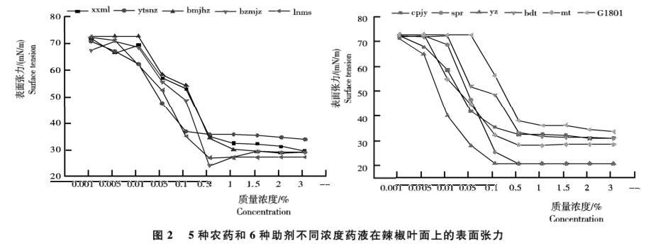從圖2看出,隨著藥液濃度增加,5種農(nóng)藥和6種助劑藥液在辣椒葉面上的表面張力呈逐漸減小趨勢。