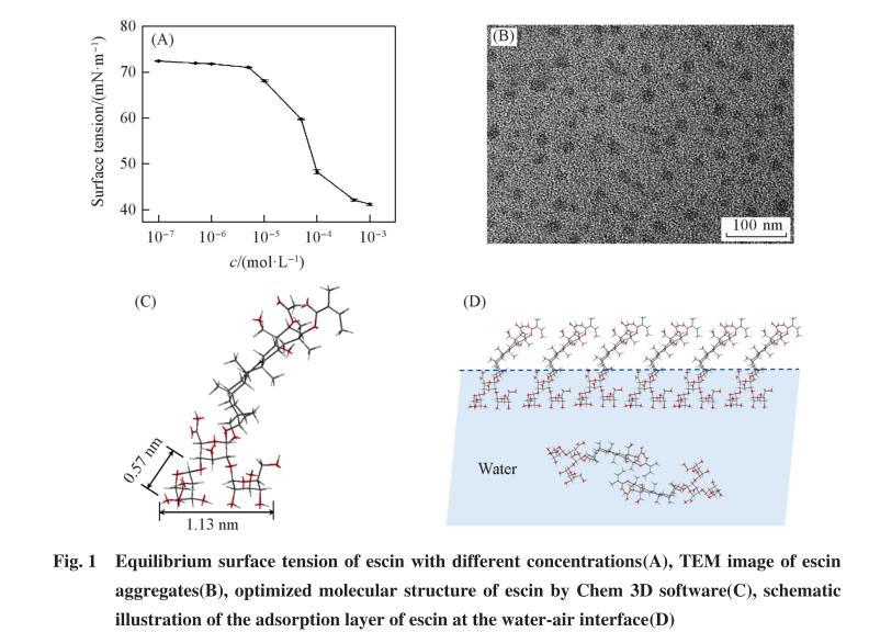 首先,采用吊片法測量了不同濃度七葉皂素溶液的表面張力.由于七葉皂素溶解度的限制,當濃度超過1×10-3mol/L時會有少量固體物質析出,影響測試結果,故表面活性測試的濃度范圍為1×10-7~1×10-3mol/L.如圖1(A)所示,隨著七葉皂素濃度的增加,表面張力呈現(xiàn)先基本不變、后快速下降、最后達到平衡的3個階段.這是由于濃度低于1×10-5mol/L時,只有少量七葉皂素分子吸附在氣-液界面,表面張力基本不變;然后隨著濃度增加,越來越多的分子遷移并吸附在氣-液界面,使溶液表面張力快速下降;當分子在界面吸附達到飽和(5×10-4mol/L)后,開始在體相聚集形成膠束,表面張力不再改變.可知,七葉皂素的臨界膠束濃度(cmc)為5×10-4mol/L,對應的表面張力(γcmc)為42.1 mN/m.圖1(B)為七葉皂素形成聚集體的TEM照片,膠束大小約為20 nm.