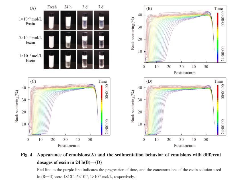 可見,七葉皂素濃度為1×10-4和5×10-4mol/L時,在24 h內分層較明顯,前者的分層程度略大于后者,當濃度為1×10-3mol/L時,分層得到明顯抑制,較為穩(wěn)定,該現(xiàn)象與貯存穩(wěn)定性表征結果一致[圖4(A)].這是由于兩親性的七葉皂素分子結構具有較多的含氧基團(羥基和羧基),在油-水界面層具有強分子間作用(氫鍵),高濃度形成的界面膜的收縮彈性強于低濃度,在油-水界面發(fā)生形變時,界面膜產生相應形變而非解吸附,因此高濃度七葉皂素所形成的乳液穩(wěn)定性相對更好.