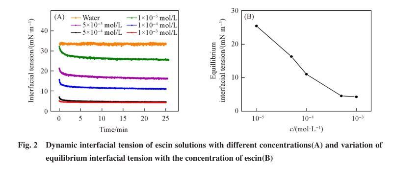 使用視頻光學接觸角測量儀,利用懸滴法測定溶劑油150#和不同濃度七葉皂素溶液的油-水界面張力.溶液為內相,溶劑油150#為外相.將七葉皂素溶液置于氣密性良好的注射器(針管外徑為1.65 mm)中,利用步進馬達將溶液(8μL)注射到裝有溶劑油150#的玻璃皿中,CCD攝像機同步記錄測定過程的液滴狀態(tài)(每次測定25 min),軟件通過液滴形狀分析計算出界面張力.分別測定超純水以及不同濃度七葉皂素溶液與溶劑油150#的界面張力,每個樣品重復測3次.