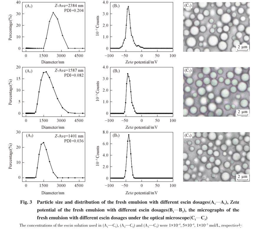 首先使用激光粒度儀表征了新制乳液的粒徑大小及分布情況,如圖3(A1)~(A3)所示.隨著七葉皂素濃度從1×10-4mol/L增大到1×10-3mol/L,乳液平均粒徑Z-Ave從約2.4μm下降至1.4μm,單分散系數(shù)(PDI)逐漸降低,粒徑分布范圍逐漸變窄,表明乳液穩(wěn)定性得以提高.光學顯微鏡表征結果[圖3(C1)~(C3)]也印證了該結論.