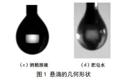 試驗(yàn)為比較3種液體表面張力的大小,采用懸滴法對(duì)液體的表面張力進(jìn)行測(cè)量,懸滴法的基本原理是:處于毛細(xì)管端液體懸滴的形狀與液體的表面張力有關(guān),在重力作用下,毛細(xì)管端形成的球形液滴的形變,隨著液滴有效密度的增加而增加并隨著液滴界面張力的增加而減小。通過(guò)Young–Laplace方程可以推導(dǎo)得到懸滴法計(jì)算表面張力的基本方程: