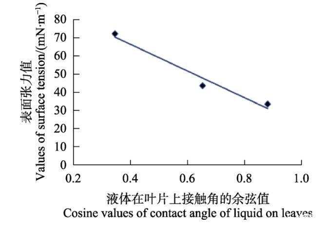 采集新鮮的芒果葉片,新老葉比例1∶1,取其平整部分且不破壞其葉面結(jié)構(gòu),用雙面膠將其固定在載玻片上構(gòu)成平面,使葉面保持自然狀態(tài)。分別將水、二甲基甲酰胺(DMF)、二甲基亞砜(DMSO)3種液體通過微量注射器滴加到葉面上,當(dāng)液體在葉面形成液滴后,通過接觸角測(cè)定儀拍照后測(cè)量其接觸角。從滴加樣品到測(cè)得接觸角在5 s內(nèi)完成,每個(gè)處理重復(fù)10次,取平均值。液體的表面張力值通過表面張力儀測(cè)定,每個(gè)處理重復(fù)5次,取平均值。將測(cè)得的水、DMF、DMSO液體表面張力值和接觸角的cosθ值分別為橫縱坐標(biāo)作圖,獲取回歸方程,當(dāng)接觸角為零時(shí)求得芒果葉的臨界表面張力值。為確保液滴的完整性和穩(wěn)定性,整個(gè)測(cè)定過程的溫度保持在25~28℃,相對(duì)濕度為80%左右的封閉環(huán)境下進(jìn)行。