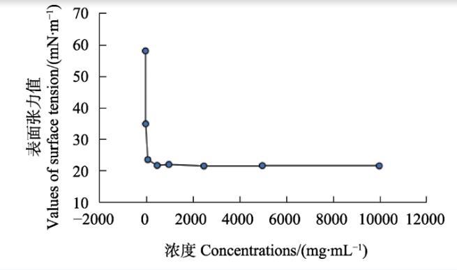 按國家標(biāo)準(zhǔn)GB 5549—2010的方法,將助劑380配置成1、10、100、1000、10 000、100 000 mg/mL系列濃度,用表面張力儀測(cè)定相應(yīng)濃度藥液的表面張力。以濃度和其對(duì)應(yīng)的表面張力值分別為橫縱坐標(biāo)作圖,獲得一條曲線,曲線拐點(diǎn)對(duì)應(yīng)的濃度即為助劑380的臨界膠束濃度。