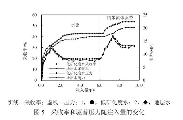在驅(qū)油機(jī)理實驗探究的基礎(chǔ)上,優(yōu)選納米ZIF-8顆粒質(zhì)量分?jǐn)?shù)為0.03%的納米流體進(jìn)行巖心驅(qū)替實驗。采收率及驅(qū)替壓力隨注入體積的變化如圖5所示。使用模擬地層水、低礦化度水首次驅(qū)替至無油產(chǎn)出時的采收率分別為40.24%、43.06%。轉(zhuǎn)注含納米ZIF-8顆粒的流體后,受益于巖石表面潤濕性向著更加水濕轉(zhuǎn)變以及油水間界面張力的降低,油滴更易被剝落,且在流動過程中更易被注入液包裹形成乳狀液,增強(qiáng)了微觀驅(qū)替效率,從而使得最終采收率分別提高了8.25百分點和10.71百分點。注入納米流體后,驅(qū)替壓力得到了一定的提升。這可能是由于納米顆粒堵住了部分高滲通道,流體向孔滲條件較差的小孔隙流動,從而提高了波及效率,在一定程度上也有助于采收率的提高。