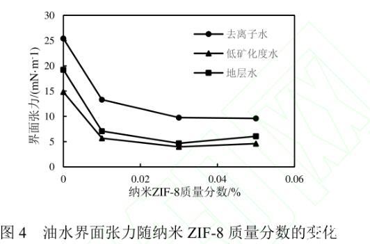 用不同礦化度水制備的納米ZIF-8流體與模擬油間的界面張力隨ZIF-8加量的變化如圖4所示。未加入納米粒子時,3種礦化度水與原油間的界面張力分別為25.41、19.23和14.84 mN/m。適當(dāng)稀釋地層水的礦化度可以降低油水間界面張力,這與文獻(xiàn)報道的結(jié)果一致。添加0.01%~0.05%納米ZIF-8后,納米流體與原油間的界面張力均明顯降低。其中,納米ZIF-8加量為0.03%的低礦化度水的油水界面張力值為3.97 mN/m,比未添加ZIF-8時降低了73.25%。這是由于納米顆粒在油水間產(chǎn)生了層狀結(jié)構(gòu),使其在界面上排列更緊密,從而降低了油水界面張力。在模擬地層水中,油水界面張力隨納米ZIF-8加量的增加呈現(xiàn)先降低后增大的趨勢,在加量為0.03%時達(dá)到最低。當(dāng)ZIF-8加量為0.05%時,流體的穩(wěn)定性變差,部分納米顆??赡馨l(fā)生聚沉現(xiàn)象,導(dǎo)致降低油水界面張力能力減弱。