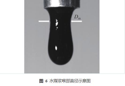 與純液體不同,由于漿體液固混合物流變性和屈服應(yīng)力等參數(shù)的影響,漿體破裂過(guò)程更加復(fù)雜。在漿體破裂末期,當(dāng)水煤漿液橋的喉部直徑(Dm,如圖6所示)尺寸很小時(shí),固體顆粒將會(huì)發(fā)揮顯著影響。典型水煤漿破裂實(shí)驗(yàn)照片如圖7所示,由于微觀破裂條件下液固出現(xiàn)部分分離,煤粉顆粒在液橋喉部附近凸出氣液界面,使得原本光滑的水煤漿表面逐漸粗糙,其變化特性與水煤漿黏度、表面張力和屈服應(yīng)力等參數(shù)密切相關(guān)。