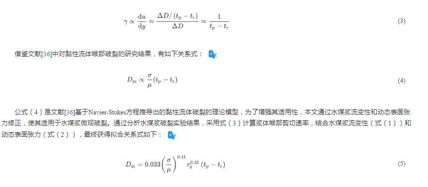 公式(4)是文獻(xiàn)基于Navier-Stokes方程推導(dǎo)出的黏性流體破裂的理論模型,為了增強(qiáng)其適用性,本文通過(guò)水煤漿流變性和動(dòng)態(tài)表面張力修正,使其適用于水煤漿微觀破裂。通過(guò)分析水煤漿破裂實(shí)驗(yàn)結(jié)果,采用式(3)計(jì)算漿體喉部剪切速率,結(jié)合水煤漿流變性(式(1))和動(dòng)態(tài)表面張力(式(2)),最終獲得擬合關(guān)系式如下: