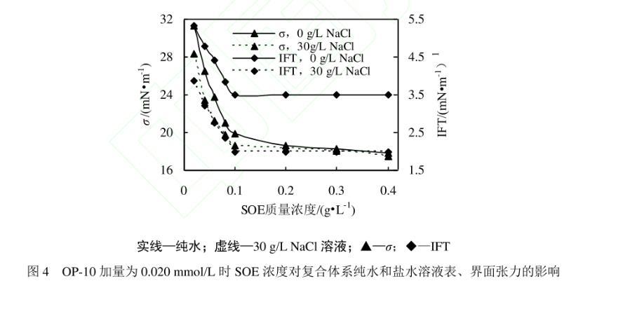 圖4 OP-10加量為0.020 mmol/L時(shí)SOE濃度對(duì)復(fù)合體系純水和鹽水溶液表、界面張力的影響