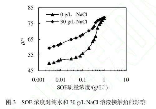 圖3 SOE濃度對(duì)純水和30 g/L NaCl溶液接觸角的影響