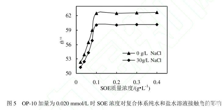 圖5 OP-10加量為0.020 mmol/L時(shí)SOE濃度對(duì)復(fù)合體系純水和鹽水溶液接觸角的影響