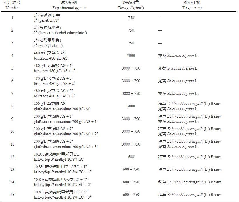 植物葉片性質(zhì)的不同會影響藥液的潤濕和持留能力。接觸角測定結(jié)果(表3)顯示:無論靶標作物是禾本科的稗草還是闊葉科的龍葵,2#增效劑的接觸角均最小,且3種除草劑中添加2#增效劑后接觸角減小的程度最大(6,10,14),添加3#增效劑后接觸角減小的程度最小,因此,2#增效劑減小接觸角的性能最好。