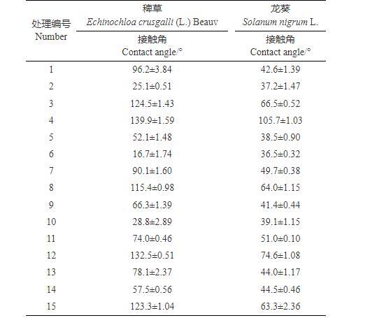 1.2.4接觸角測定選取新鮮且潔凈的均為6葉期的稗草和龍葵葉片,避開葉脈和病斑,選取平整部分剪取小塊的葉肉,滴加5μL待測樣品,10 s后記錄接觸角大小,至少重復(fù)3次,計算平均接觸角。