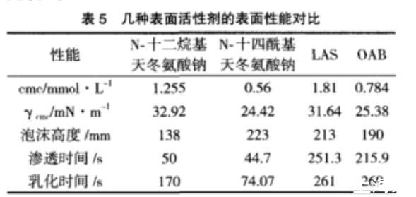 對(duì)N-十四?;於彼徕c鹽的幾項(xiàng)表面性能進(jìn)行了測(cè)定,并與其他表面活性劑進(jìn)行了對(duì)比,結(jié)果見表5。