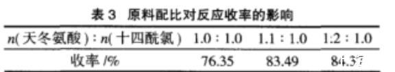 采用天冬氨酸稍過量,一方面可以抑制酰氯的水解,另一方面又有利于提純。選取n(天冬氨酸)∶n(十四酰氯)=1.0~1.2∶1.0。在反應(yīng)體系pH=10~11、反應(yīng)時(shí)間3.5h、反應(yīng)溫度5℃條件下,考察不同原料配比對(duì)反應(yīng)的影響,結(jié)果如表3所示。