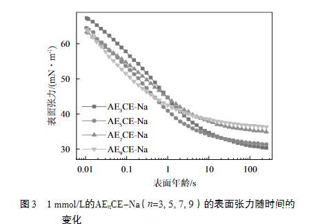 前面已經(jīng)討論了溶液平衡時(shí)的特性與規(guī)律,但沒(méi)有考慮平衡及老化的時(shí)間,而時(shí)間因素在實(shí)際應(yīng)用中起著決定性的作用。當(dāng)表面活性劑分子從本體相遷移到表面時(shí),分子的動(dòng)態(tài)吸附性能會(huì)影響表面活性劑的性能。因此,如圖3所示,測(cè)試了1 mmol/L的不同EO加合數(shù)的AEnCE-Na的表面張力隨時(shí)間的變化曲線(xiàn)。
