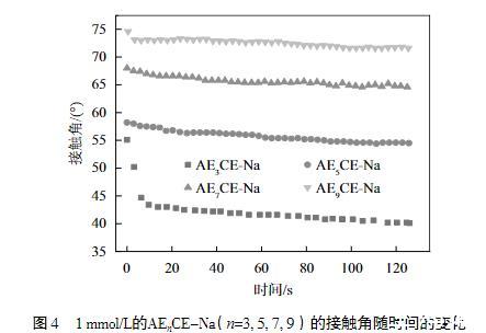 圖4 1 mmol/L的AEnCE-Na(n=3,5,7,9)的接觸角隨時(shí)間的變化