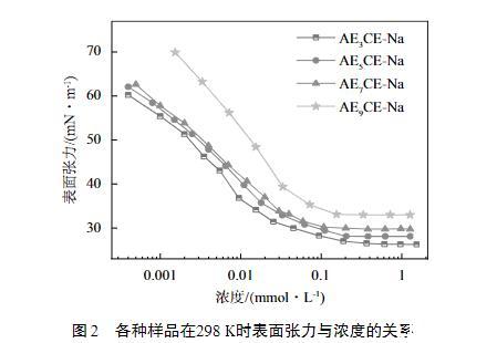 分子定向吸附到氣/液界面高效降低溶液的表面張力是表面活性劑的一大特性,表面張力的數(shù)據(jù)也是研究表面活性劑在界面的組成及自身的結(jié)構(gòu)和性能的基礎(chǔ)。因此,探究了不同EO加合數(shù)的AEnCE-Na的表面張力與濃度的關(guān)系,結(jié)果如圖2所示。由圖2可以看出,溶液的表面張力隨濃度的增大先急劇下降后基本保持不變,此外,還可以得到臨界膠束濃度(cmc)和臨界膠束濃度對(duì)應(yīng)的表面張力(γcmc)。表面活性劑分子在氣/液界面的最大吸附量(Γmax)、每個(gè)分子所占的最小截面積(Amin)及表面張力降低20 mN/m所需濃度的負(fù)對(duì)數(shù)(pc20)可以通過(guò)公式1)~3)計(jì)算得到。