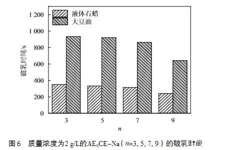 表面活性劑的另一大用途是通過(guò)降低油/水界面的界面張力而用作乳化劑,穩(wěn)定存在的乳液被廣泛應(yīng)用于食品、藥品和個(gè)人護(hù)理等方面。因此,測(cè)試了不同EO加合數(shù)的AEnCE-Na對(duì)大豆油和液體石蠟的破乳時(shí)間,結(jié)果如圖6所示。