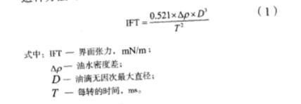 采用芬蘭Kibron dIFT雙通道動(dòng)態(tài)界面張力儀進(jìn)行界面張力測(cè)定。此張力儀的原理是:液滴通過旋轉(zhuǎn)處于一定的離心場(chǎng)中,這時(shí)兩種液體之間的界面張力及旋轉(zhuǎn)的速度就決定了液滴的形狀,液滴的平衡形狀通過調(diào)整轉(zhuǎn)速得到改變,而使液滴以一定的角速度自轉(zhuǎn),這時(shí)通過離心力、重力以及界面張力的三種力量的共同作用下,在高密度的液體中,低密度的液滴能夠形成圓柱形或長(zhǎng)橢球形液滴。這種方法可以測(cè)定出10-6mN/m的超低界面張力。