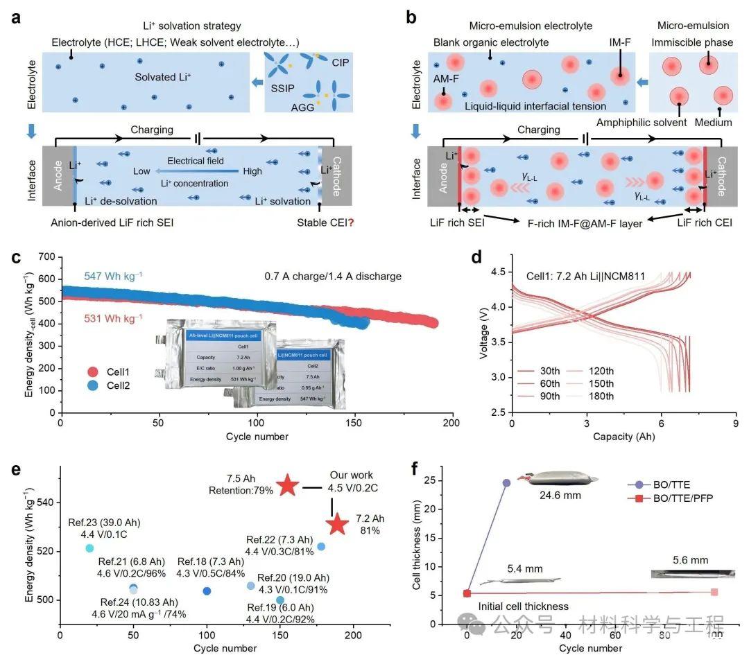 為突破這一瓶頸,團隊提出基于液-液界面張力(γL–L)的界面調(diào)控新策略,發(fā)明了一類新型的非均相微乳電解液,成功將溶解性較差的功能性溶劑組分引入至電解液體系。通過分子設計,使全氟溶劑與局部氟化兩親性溶劑通過分子間作用力絡合形成微乳膠團(50~120 nm),將氟化相均勻穩(wěn)定地分散于電解液連續(xù)相中,進一步利用γL–L驅(qū)動力使這些功能組分遷移,同步富集于正負極界面,構(gòu)建梯度分布的氟化界面溶劑化層(圖1b)。這種不依賴電場方向和濃度梯度的界面結(jié)構(gòu)構(gòu)建方式,有效解耦了溶劑化結(jié)構(gòu)和界面保護機制,減弱了高活性溶劑與電極的接觸,顯著抑制了界面副反應,實現(xiàn)了對正負極界面協(xié)同的動態(tài)保護。研究表明,采用該策略研制的安時級Li||NCM811軟包電池呈現(xiàn)出非常優(yōu)異的性能:能量密度高達547/531 Wh kg-1,循環(huán)155/189次后容量保持率仍達79%/81%(圖1c),為目前行業(yè)領(lǐng)先水平;同時抑制了電池在循環(huán)過程中的產(chǎn)氣,針刺無壓降不起火,突破了高比能電池安全性差的瓶頸。