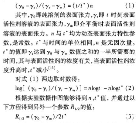 其中,即純?nèi)軇┑谋砻鎻埩?,即t時(shí)刻表面活性劑溶液的表面張力,即介平衡時(shí)表面活性劑溶液的表面張力。n與t均為動(dòng)態(tài)表面張力特性參數(shù),是常數(shù)。t與時(shí)間的單位相同,n是無(wú)因次量。t的值即達(dá)到。與7數(shù)值之和的一半所需要的時(shí)間,其與表面活性劑的濃度有關(guān),當(dāng)表面活性劑濃度升高時(shí),t減小。