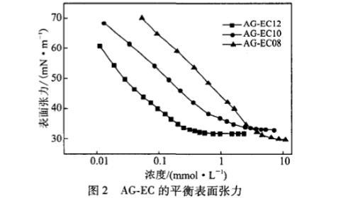 以去離子水為溶劑配制不同濃度的AG.EC溶液,靜置12 h后利用krussK12表面張力儀通過(guò)wilhelmy吊片法測(cè)定其平衡表面張力。控制溶液溫度(254-0.3)clC,測(cè)定前去離子水校準(zhǔn)表面張力儀至(72±0.3)mN/m。由表面張力()一濃度對(duì)數(shù)(1gc)圖,可得AG.EC在水中的臨界膠束濃度(cmc)以及cmc下的表面張力(一)。
