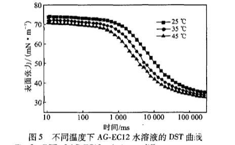 由圖5可知,當溫度升高,DST下降的速率明顯加快。這是因為分子的不規(guī)則運動更加激烈,使得分子間的引力減小。表面張力越早開始下降,在各個階段的表面張力值就越低。在45℃下開始測量時,表面張力已經降到了70mN/m左右,這也許是由于溫度升高降低了純溶劑水的表面張力。升高溫度,表面張力下降的更快,更易達到第四個階段平衡狀態(tài)。這說明了高溫下其動態(tài)表面活性更好??赡苁怯捎诒砻婊罨茉诟邷貢r更低,使得AG.EC分子更易在溶液表面吸附。