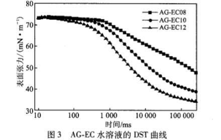 2.2.1烷基糖苷檸檬酸單酯二鈉鹽的烷基鏈長對其水溶液動態(tài)表面張力的影響圖3為不同烷基鏈長的AG-EC水溶液(2.26mmoL/L)的DST隨時間變化的情況。