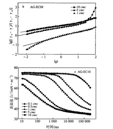 在25cc下測定不同濃度AG.EC水溶液的DST,并利用Rosen模型處理,得到其動態(tài)表面張力參數(shù),見圖4、表1。