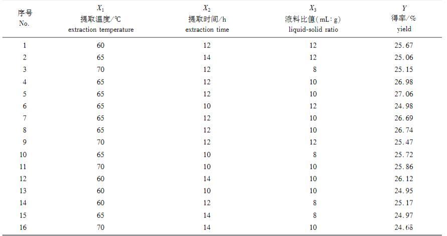通過軟件分析得到肥皂莢皂苷的最優(yōu)提取條件為:溫度69.20℃、時間11.28 h、液料比值9.89,皂苷得率的預(yù)測值為26.44%。為了操作方便,修正提取條件為:溫度69℃、時間11 h 15 min、液料比值為10。在此條件下對肥皂莢皂苷進(jìn)行水浸提,并做3次重復(fù)性實驗,平均得率為26.49%,與理論值誤差僅為0.05%。表明該模型可以較好地預(yù)測肥皂莢皂苷的提取工藝。