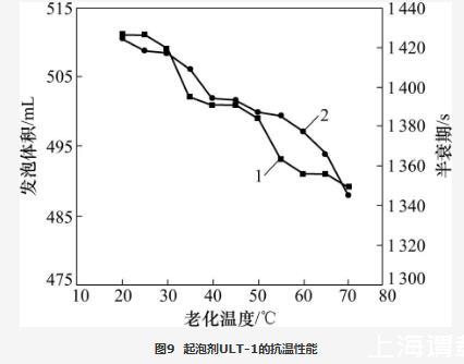 將起泡劑溶液在一定溫度下老化一定時間后,測試其發(fā)泡體積和泡沫半衰期的變化以評價其抗溫性能。稱取0.2 g起泡劑ULT-1于攪拌杯中,加入100 mL蒸餾水,置于攪拌器之上,以轉(zhuǎn)速11 000 r/min攪拌1 min。裝入老化罐,放入滾子加熱爐,在一定溫度下滾動16 h,取出冷卻至室溫,以轉(zhuǎn)速11 000 r/min攪拌1 min,測量發(fā)泡體積和半衰期。通過改變老化溫度測量起泡性能與老化溫度的關(guān)系,結(jié)果如圖9所示。從圖9可知:0.2%的新型起泡劑溶液在一定溫度范圍內(nèi)(20~70℃),隨著老化溫度的升高起泡性能基本不變,表明研制的新型起泡劑ULT-1具有較好的抗溫性能。