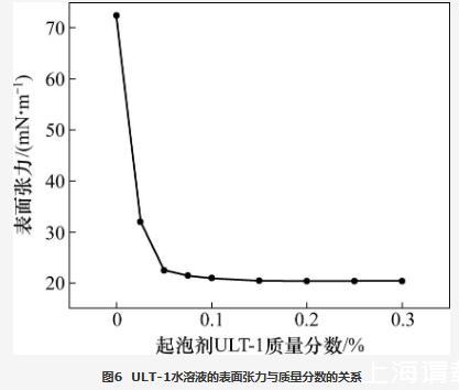 當(dāng)起泡條件相同時,起泡劑水溶液的表面張力越低,發(fā)泡體積越高。配制一系列濃度梯度的起泡劑ULT-1水溶液,利用接觸角/表面張力測量儀采用懸滴法測量表面張力與起泡劑ULT-1質(zhì)量分數(shù)的關(guān)系,結(jié)果如圖6所示。從圖6可知:當(dāng)起泡劑ULT-1質(zhì)量分數(shù)小于0.05%時,表面張力隨起泡劑ULT-1質(zhì)量分數(shù)的提高快速降低;當(dāng)起泡劑ULT-1質(zhì)量分數(shù)大于0.05%時,表面張力降幅越來越??;當(dāng)起泡劑ULT-1質(zhì)量分數(shù)提高至0.2%時,表面張力降至20.40 mN/m,較蒸餾水降低了71.82%,繼續(xù)提高起泡劑ULT-1的質(zhì)量分數(shù),表面張力不再降低。表明新型起泡劑ULT-1在較低濃度時即達到較低的表面張力,有利于提高發(fā)泡體積。