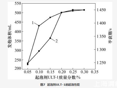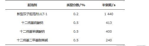 起泡性能主要是指起泡能力和泡沫穩(wěn)定性。發(fā)泡體積V0反映了起泡能力,析液半衰期t1/2反映了泡沫穩(wěn)定性。在室溫下,稱取一定質(zhì)量的起泡劑ULT-1于攪拌杯中,加入100 mL蒸餾水,置于攪拌器之上,以轉(zhuǎn)速11 000 r/min攪拌1 min。攪拌完畢后,立即取下攪拌杯,同時啟動秒表,開始記錄消泡時間,將攪拌杯中的所有物質(zhì)全部倒入1 000 mL量筒中,讀取發(fā)泡體積和從泡沫中析出50 mL液體的時間,即為半衰期。通過改變起泡劑ULT-1的質(zhì)量測量起泡性能與起泡劑質(zhì)量分數(shù)的關(guān)系,結(jié)果如圖7所示。從圖7可知:隨起泡劑ULT-1質(zhì)量分數(shù)的提高,發(fā)泡體積增加幅度較大,半衰期緩慢增加。當(dāng)ULT-1質(zhì)量分數(shù)升到0.2%時,發(fā)泡體積達到501 mL,半衰期達到1 440 s,繼續(xù)提高質(zhì)量分數(shù)發(fā)泡體積和半衰期基本不變,表明研制的新型起泡劑ULT-1低濃度時即具有較高的起泡性能,發(fā)泡體積高,泡沫半衰期長。同時,對比評價了常用起泡劑的半衰期,結(jié)果如表1所示。從表1可知:質(zhì)量分數(shù)為0.2%的起泡劑ULT-1與質(zhì)量分數(shù)為0.5%的常規(guī)起泡劑相比,泡沫半衰期可提高3倍以上。