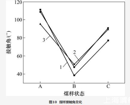 煤樣潤濕性變化主要反映了起泡劑在煤樣表面的吸附與脫附情況,可以根據(jù)接觸角θ判斷潤濕性情況。通常把θ=90°作為是否潤濕的界限,θ>90°表明不潤濕,θ<90°表明潤濕,θ越小,潤濕性能越好。分別取滇東黔西地區(qū)的松河15號煤樣、恩洪16號煤樣和天井8號煤樣,利用接觸角/表面張力測量儀通過五點擬合法分別測量純水在原始煤樣(A狀態(tài))、0.2%起泡劑ULT-1溶液浸泡1 h烘干的煤樣(B狀態(tài))、0.2%起泡劑ULT-1溶液浸泡1 h后低速水流沖洗1 h烘干的煤樣(C狀態(tài))表面的接觸角,結(jié)果如圖10所示。將C狀態(tài)接觸角與B狀態(tài)接觸角的差值定義為接觸角增加值,C狀態(tài)接觸角與A狀態(tài)接觸角的比值定義為潤濕性恢復(fù)值,間接反映了新型起泡劑ULT-1在煤樣表面的脫附程度,潤濕性恢復(fù)值越大,越易脫附,脫附程度越大。原始煤樣接觸角均大于90°,為水不潤濕(A狀態(tài)),起泡劑ULT-1在煤樣表面吸附后接觸角均小于90°,將煤樣表面變?yōu)橹卸葷櫇?B狀態(tài)),但是低速水流沖洗吸附了起泡劑ULT-1的煤樣1 h后,接觸角均明顯增大,松河15號與天井8號煤樣的接觸角增加38°以上,接近90°,變?yōu)槿鯘櫇?C狀態(tài)),恩洪16號煤樣的接觸角增加43°以上,超過90°,變?yōu)椴粷櫇?C狀態(tài))。各煤樣潤濕性恢復(fù)值均超過69%,天井8號潤濕性恢復(fù)值最高達到93.70%,表明新型起泡劑ULT-1在煤層氣排液開采過程中易于脫附,有利于儲層保護。