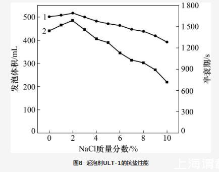 利用抗NaCl污染的能力評價質(zhì)量分數(shù)為0.2%起泡劑ULT-1水溶液的抗鹽性能。在室溫下,稱取0.2 g起泡劑ULT-1于攪拌杯中,加入100 mL蒸餾水,置于攪拌器之上,以轉(zhuǎn)速11 000 r/min攪拌1 min。直接加入一定量的NaCl,以轉(zhuǎn)速11 000 r/min攪拌1 min,測量發(fā)泡體積和半衰期。通過改變NaCl的質(zhì)量分數(shù)測量起泡性能,結(jié)果如圖8所示。從圖8可知:當(dāng)NaCl質(zhì)量分數(shù)在2%以內(nèi)時,發(fā)泡體積和半衰期緩慢增大,當(dāng)NaCl質(zhì)量分數(shù)繼續(xù)增大時,發(fā)泡體積和半衰期緩慢降低;當(dāng)NaCl質(zhì)量分數(shù)達10%時,發(fā)泡體積和半衰期仍能保持較高水平,表明研制的新型起泡劑ULT-1具有較好的抗鹽性能。