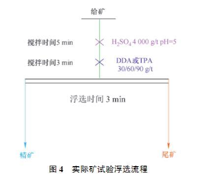 在XFG掛槽浮選機(jī)上進(jìn)行實(shí)際礦浮選試驗(yàn),轉(zhuǎn)速設(shè)為1 992 r/min。每次稱取250.0 g礦樣放入0.5 L浮選槽中,加入0.3 L自來水;綜合考量文獻(xiàn)調(diào)研、純礦物浮選結(jié)果、經(jīng)濟(jì)性等方面因素,確定礦漿pH值等于5為較佳的浮選pH條件。使用H?SO?作為pH調(diào)整劑,調(diào)節(jié)礦漿pH值為5,攪拌礦漿5 min后,加入一定量的DDA或TPA,攪拌3 min后開始用刮板刮出泡沫產(chǎn)品,每間隔3 s刮1次,浮選刮泡時(shí)間為3 min。結(jié)束后將得到的泡沫產(chǎn)品和槽內(nèi)產(chǎn)品分別烘干、稱量,測(cè)定品位,并計(jì)算產(chǎn)率與回收率。實(shí)際礦浮選試驗(yàn)流程如圖4所示。