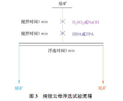 在XFG掛槽浮選機(jī)上進(jìn)行純礦物浮選試驗(yàn),轉(zhuǎn)速設(shè)為1 992 r/min。每次稱取2.00 g純礦物放入50 mL浮選槽中,然后加入40 mL超純水,用H?SO?或NaOH調(diào)節(jié)pH值,攪拌礦漿1 min,加入一定量DDA或TPA,攪拌1 min,保持充氣量恒定,充氣1 min,用刮板刮出泡沫產(chǎn)品,每間隔3 s刮1次,浮選刮泡時(shí)間為3 min。結(jié)束后將得到的泡沫產(chǎn)品(精礦)和槽內(nèi)產(chǎn)品(尾礦)分別烘干、稱量、計(jì)算回收率。進(jìn)行浮選pH及濃度試驗(yàn)時(shí),每組試驗(yàn)設(shè)置1個(gè)平行試驗(yàn),并對(duì)浮選結(jié)果求平均值。純礦物浮選試驗(yàn)流程如圖3所示。