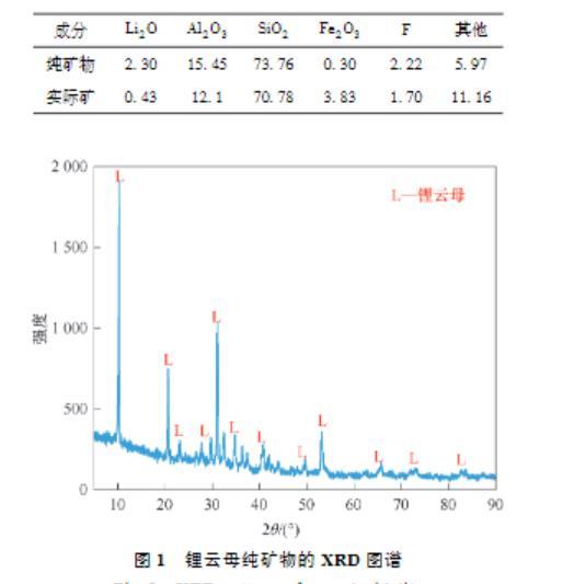 試驗(yàn)所用鋰云母純礦物為購買的高純度礦塊,實(shí)際礦試驗(yàn)所用鋰云母礦取自江西崇義,經(jīng)破碎、磨礦、篩分等流程,得到粒級(jí)為(-0.074+0.045)mm的浮選試驗(yàn)礦樣。鋰云母純礦物及實(shí)際礦多元素分析見表1,純礦物的XRD圖譜如圖1所示,可看出無明顯雜質(zhì)峰?;瘜W(xué)元素分析表明鋰云母純礦物含2.30%的Li?O,符合純礦物浮選要求。實(shí)際礦浮選試驗(yàn)礦樣含0.43%的Li?O,屬于低品位難選鋰云母礦。