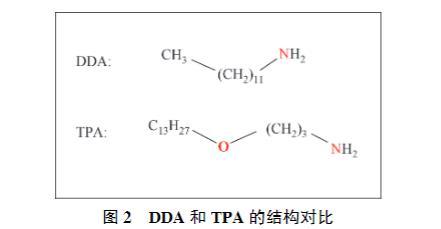 試驗(yàn)所用藥劑NaOH、H?SO?均購于廣州試劑廠;DDA購于上海阿拉丁生化科技股份有限公司,TPA為工業(yè)來源藥劑,購買自山東派尼新材料股份有限公司。試驗(yàn)用水為超純水,電阻率為18.25 MΩ·cm。捕收劑結(jié)構(gòu)如圖2所示。