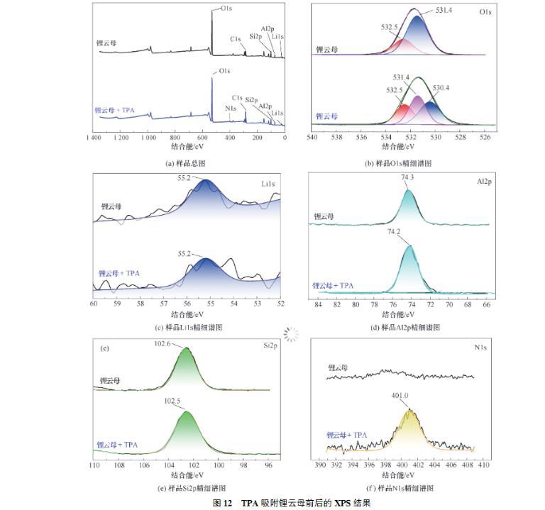 (2)接觸角試驗表明,同等條件下,TPA作用鋰云母的接觸角總是大于DDA,展現(xiàn)了TPA更強的疏水性。Zeta電位測試結果表明,TPA及DDA在鋰云母表面的吸附為靜電吸附,并且碳鏈更長的TPA由于疏水效應吸附性更好,進一步證明了TPA的強疏水性。FTIR及XPS進一步證實了TPA吸附在鋰云母表面。