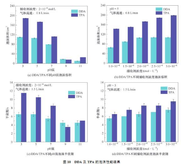 (3)在不同濃度下,TPA均得到比DDA更低的表面張力,說明TPA可能具有更多的泡沫容積,泡沫容積結果驗證了表面張力結果。在不同濃度下,TPA均得到比DDA更高的黏度,說明TPA產生的泡沫更穩(wěn)定,泡沫半衰期結果驗證了黏度結果。表面張力試驗、黏度試驗、泡沫容積試驗、泡沫半衰期試驗共同證明TPA更優(yōu)越的泡沫性能。將TPA應用于浮選中,能夠增大氣泡與鋰云母的碰撞及接觸概率,增強鋰云母與氣泡的黏附,減少鋰云母與氣泡的脫附,進而提高浮選回收率。